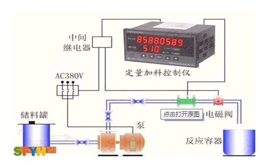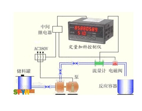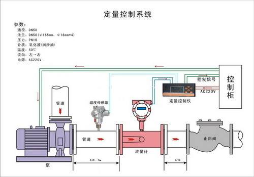 通過流量計(jì)測(cè)量流量 ,控制儀表接收信號(hào),在控制儀表里設(shè)置定量值。定量值達(dá)到后電磁閥、水泵 斷電停止工作。